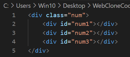 div클래스 이름이 num이고, div 클래스 안에서 id가 num인 div 코드들을 3개 추가해봅시다.