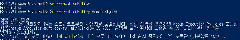 2. 권한을 바꿔주기 위해 Set-ExecutionPolicy RemoteSigned로 변경해줍니다.
