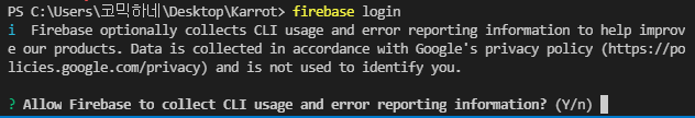 firebase를 사용하기 위해 이것저것 설정을 마치고 VSCode 터미널에서 firebase 로그인을 진행하려고 했는데 에러가 떴습니다.