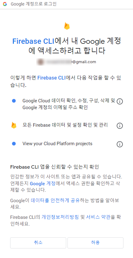 5. 터미널에서 Google 계정으로 로그인 탭으로 이동하여 firebase에 로그인하고자 하는 구글 계정으로 연동이 됩니다.
