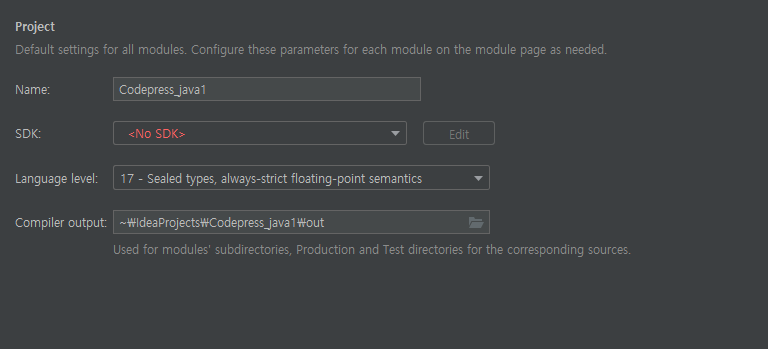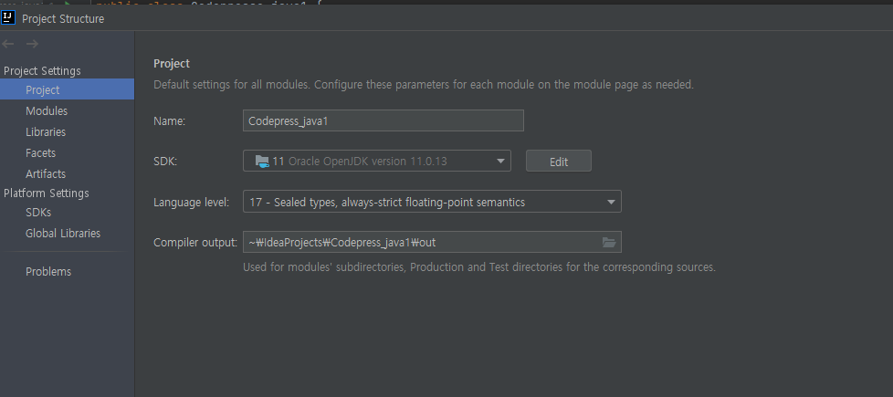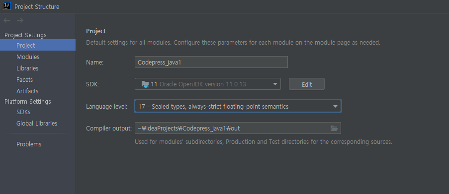SDK창으로 다시 가보니 SDK와 Language Level 버전이 맞지 않아서 발생하는 오류였다.