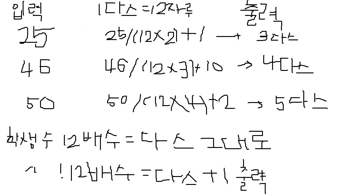 일단 입력값에서 12의 배수는 그대로 학생수/12해서 다스 값을 리턴해주면 된다고 생각했고,