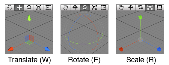 두번째 동서남북 모양 : 선택한 게임오브젝트의 3차원 좌표축(Transform)이 표시되며 해당 축을 클릭하고 드래그하면 해당 축 방향으로 이동시킬 수 있다.