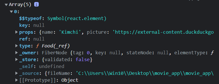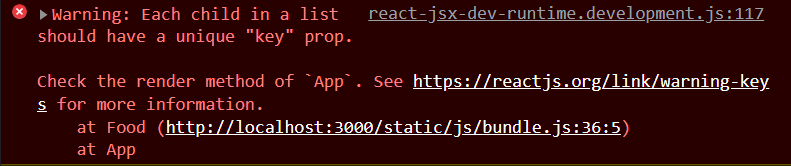 이렇게 함으로써 리액트는 Food 컴포넌트가 서로 다르다는 걸 알 방법이 없기 때문에 key props를 추가함으로써 각각의 컴포넌트가 서로 다르다는 것을 알려준다.