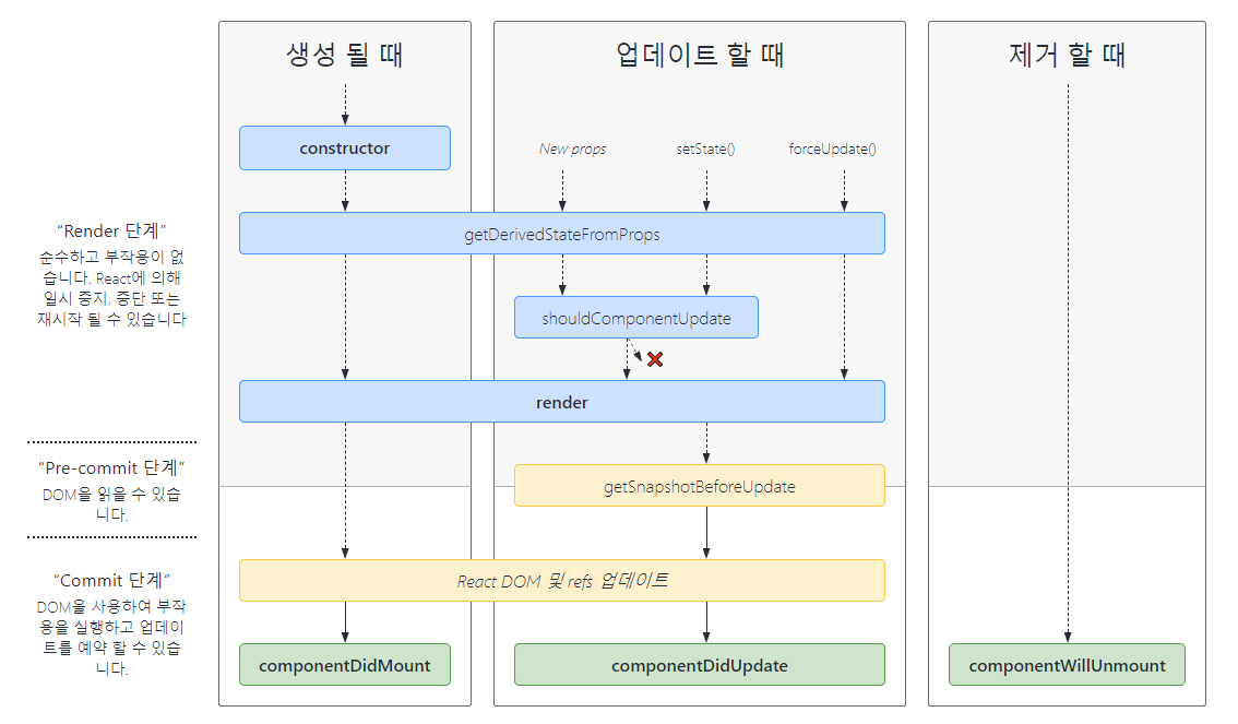 참고 ) 리액트의 컴포넌트는 지정되어이는 생명주기 함수가 존재하며 이를 재정의하여 원하는 시점에 동작을 수행할 수 있다.