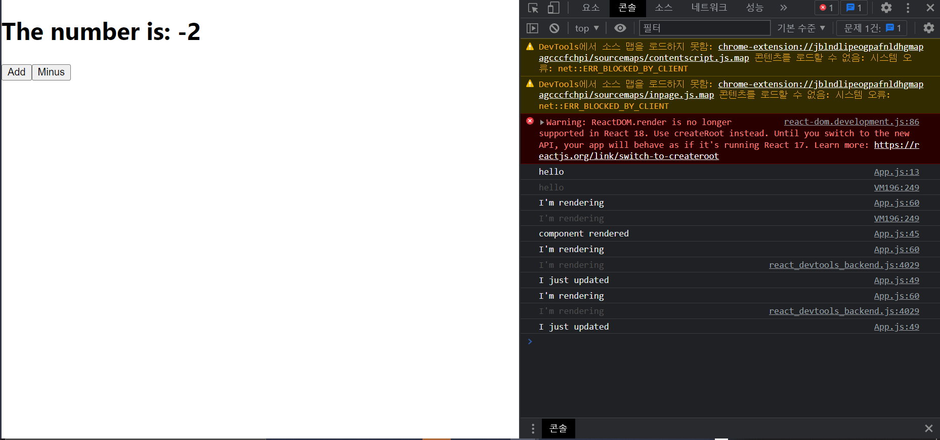 2. 버튼이 눌렸으므로 화면의 변화가 생긴다. render() 함수가 다시 실행된다.