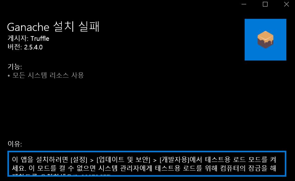 윈도우 설정 > 업데이트 기능에서 > 테스트용 앱 로드를 설정해주어야 가나쉐를 사용할 수 있다.