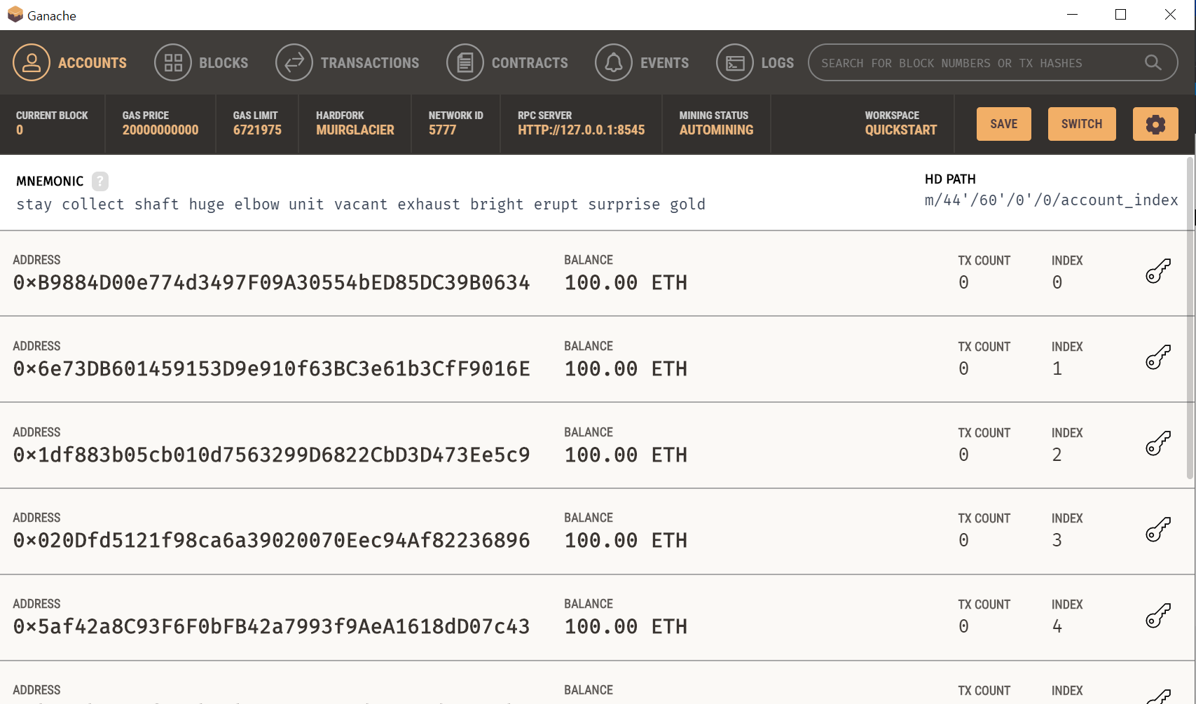 어플리케이션을 실행하면 7545번 포트로 test RPC가 구동되며, 마이닝이 활성화 되어있기 때문에 바로 컨트랙트를 배포하거나 트랜잭션 실행할 수 있는 환경이 갖춰진다 (이번 작업에서는 8545로 설정)