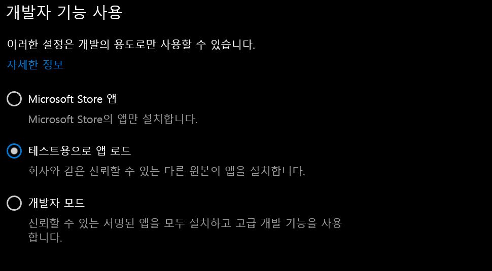 윈도우 설정 > 업데이트 기능에서 > 테스트용 앱 로드를 설정해주어야 가나쉐를 사용할 수 있다.