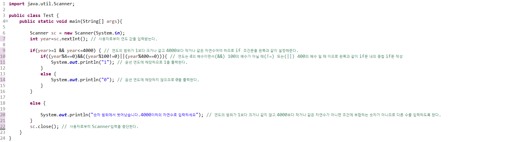 if(year>=1 && year<=4000) { // 연도의 범위가 1보다 크거나 같고 4000보다 작거나 같은 자연수여야 하므로 if 조건문을 왼쪽과 같이 설정해준다.