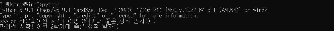 저는 이전에 파이썬을 인터프리터 프로그램을 실행한 적이 있었고, pyCharm을 통해서도 파이썬을 공부한 적이 있습니다. 그래서 윈도우에서 cmd 창을 열고 바로 python을 입력하여 파이썬 인터프리터 프로그램을 실행하였습니다.