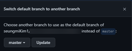 해당 repository의 Settings로 가서 default branch를 변경해줍니다.