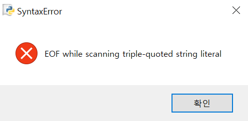 위의 코드를 보아도 """ 로 주석처리가 시작되었다면 """로 끝맺음이 있어야 하는데 그런 끝맺음을 하는 주석 코드가 없었습니다. ""' ~ """로 주석 처리를 끝까지 해주어야 합니다.